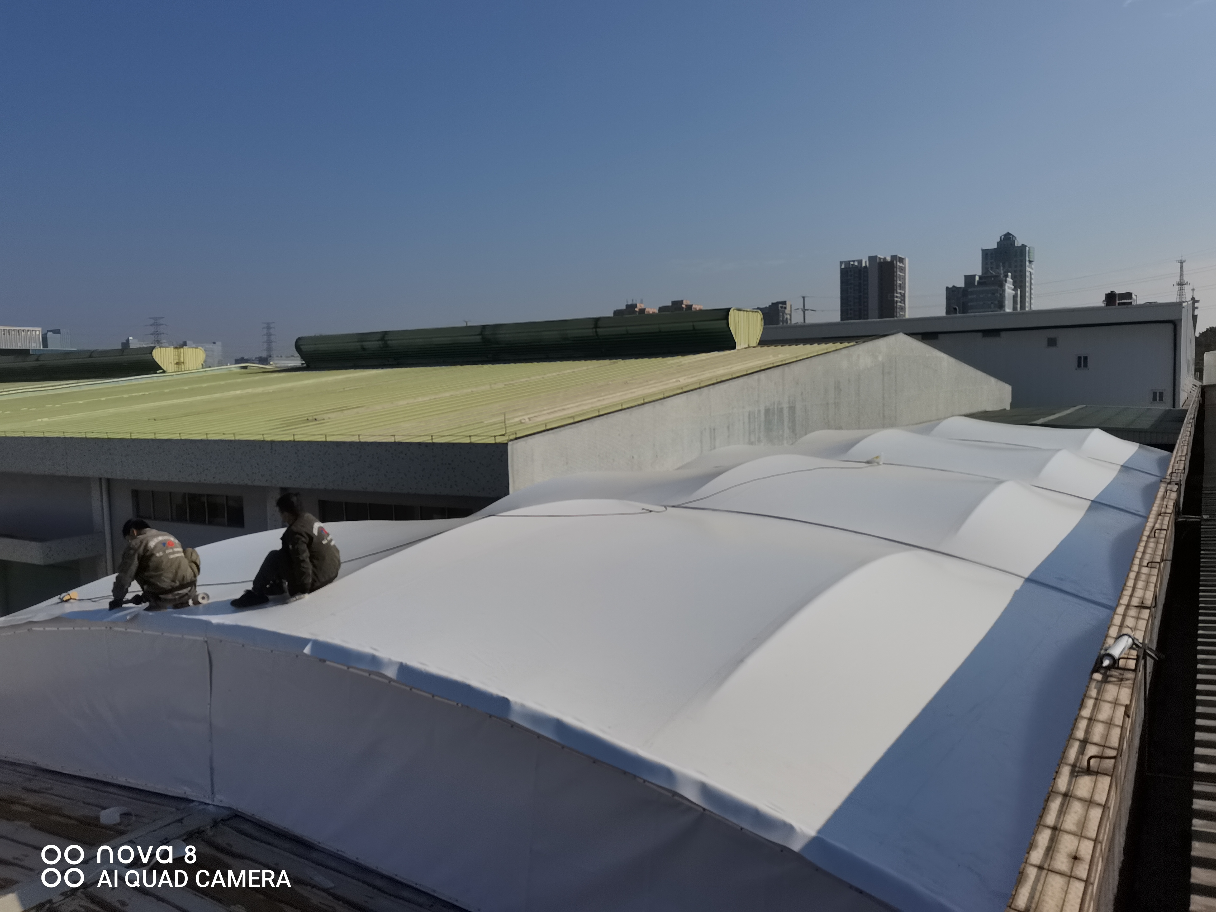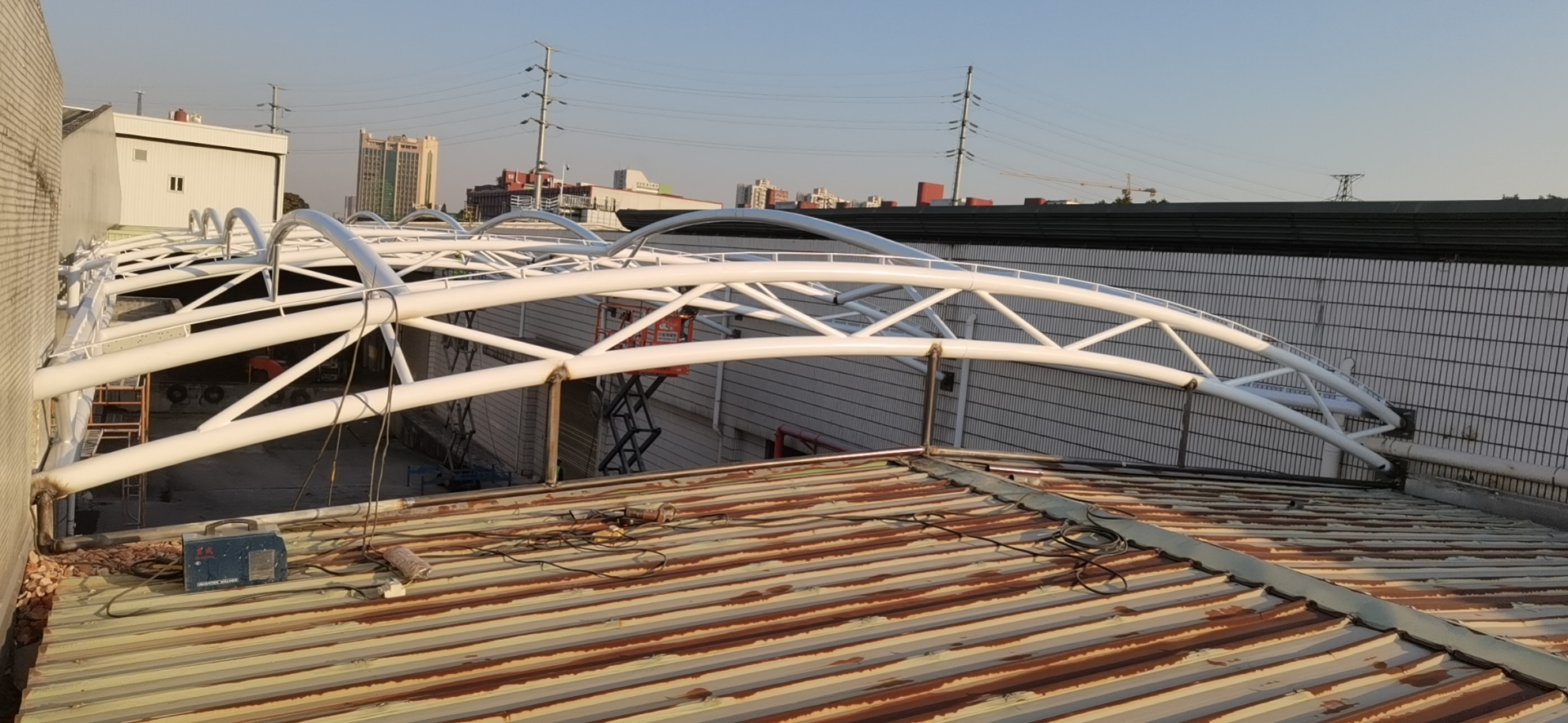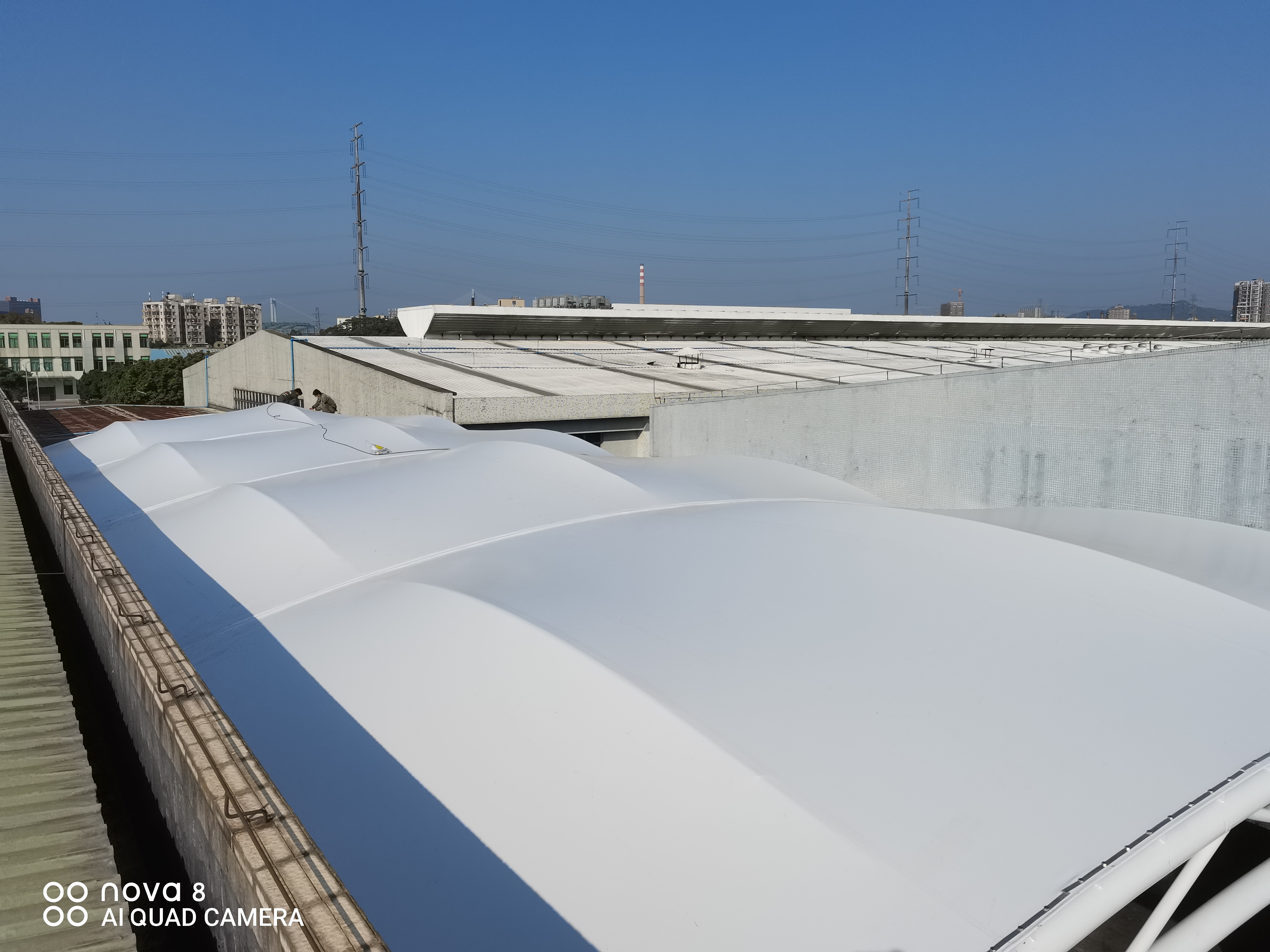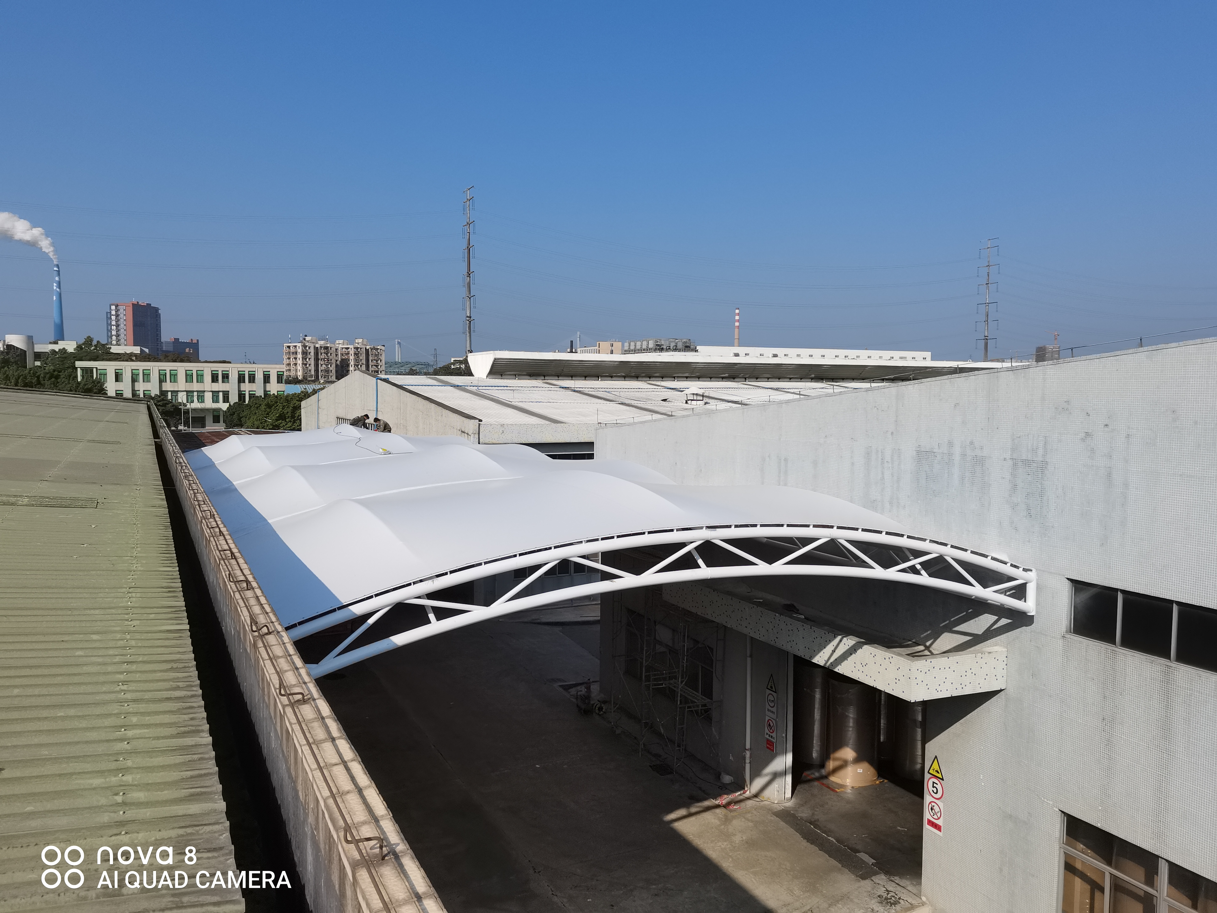 永豐余紙業(廣州)有限公司位于廣東省廣州市黃埔區夏園路5號,是方便裝卸原材料建設的走廊天幕,位于兩個生產車間之間,采用管桁架加膜結構雨棚。案例如下: