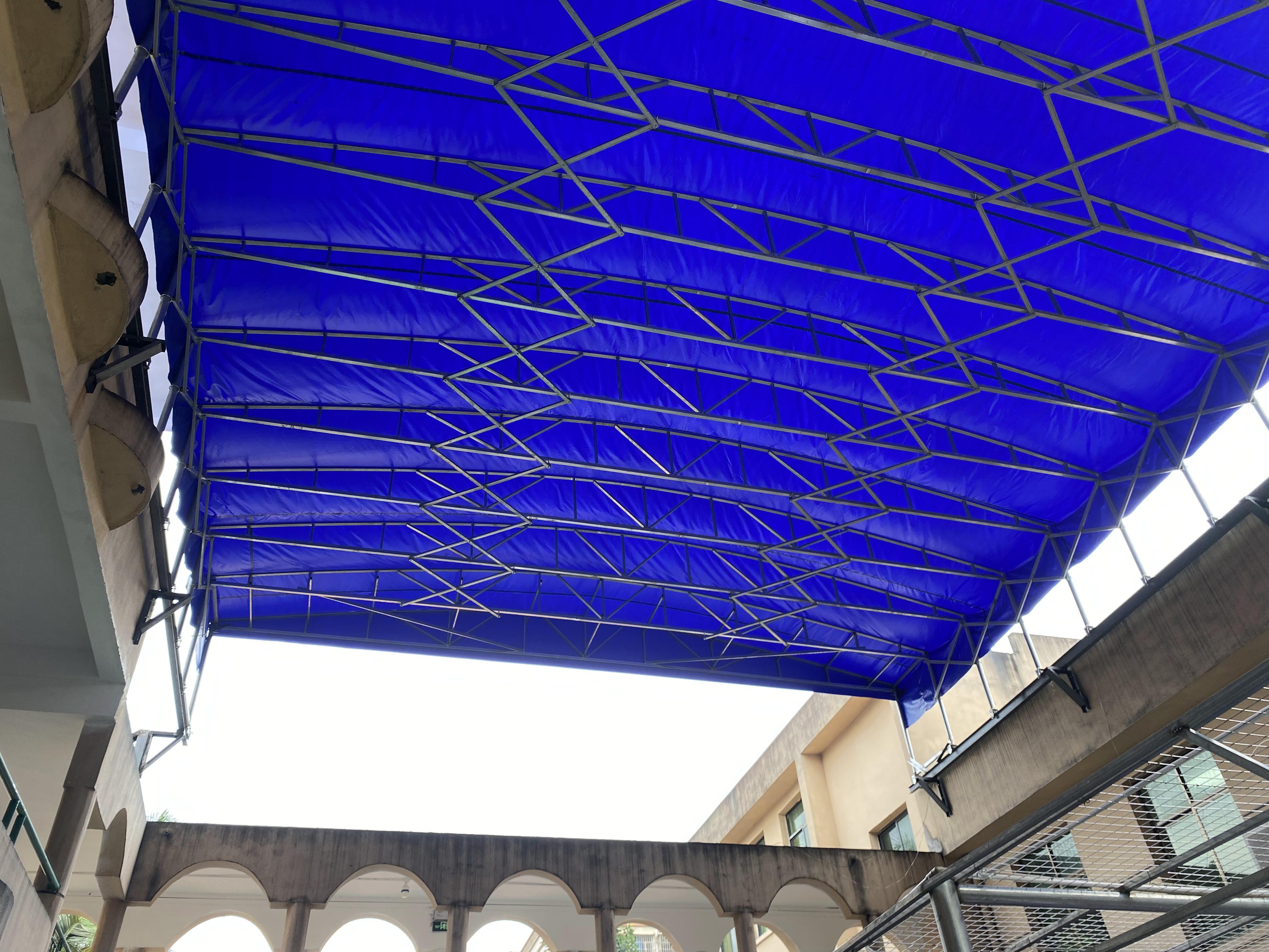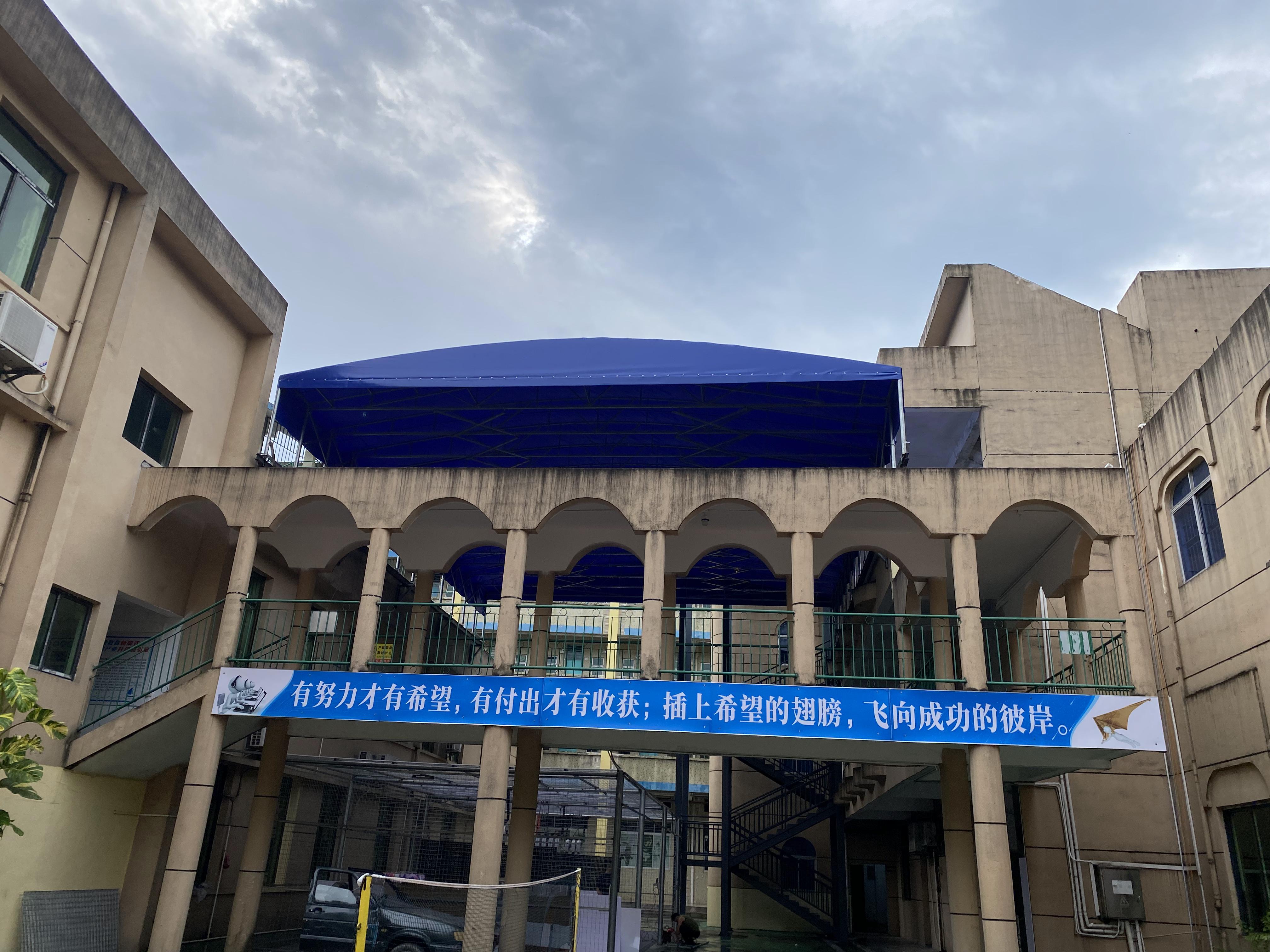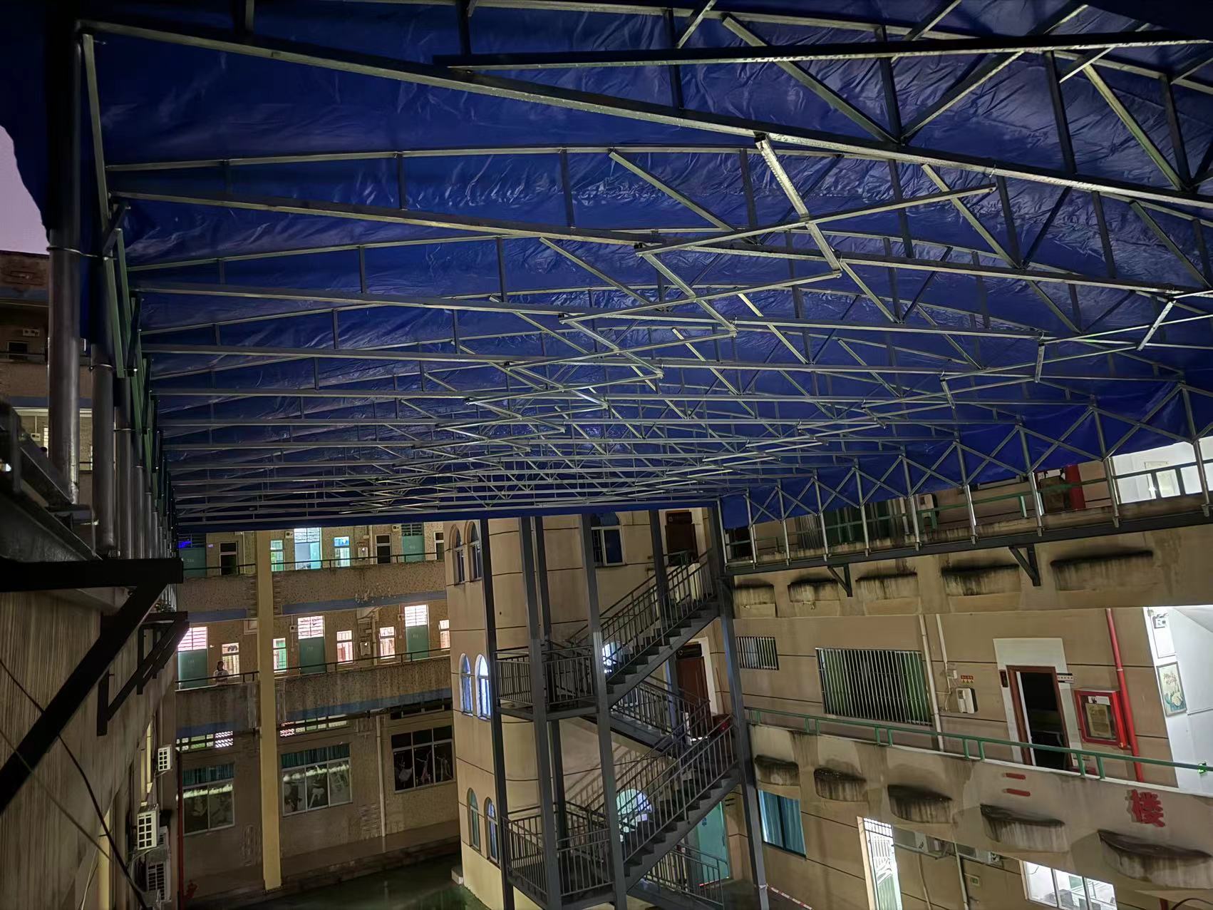 深圳市中特技工學(xué)校推拉棚方便學(xué)校教學(xué)使用采用推拉結(jié)構(gòu),平面尺寸為15米*10米,需要在兩棟教學(xué)樓之間做預(yù)埋件,一邊五個(gè)支架結(jié)構(gòu)