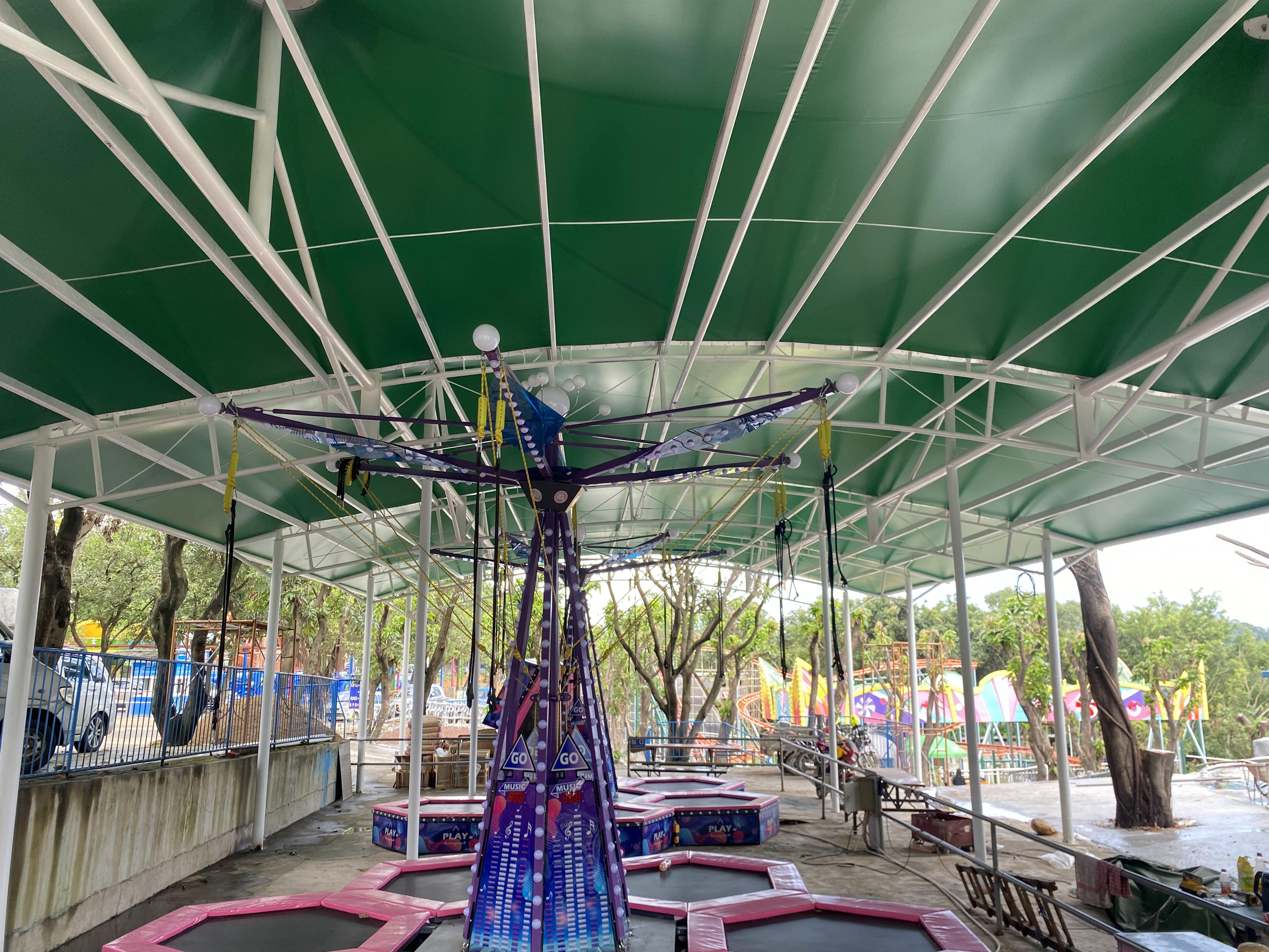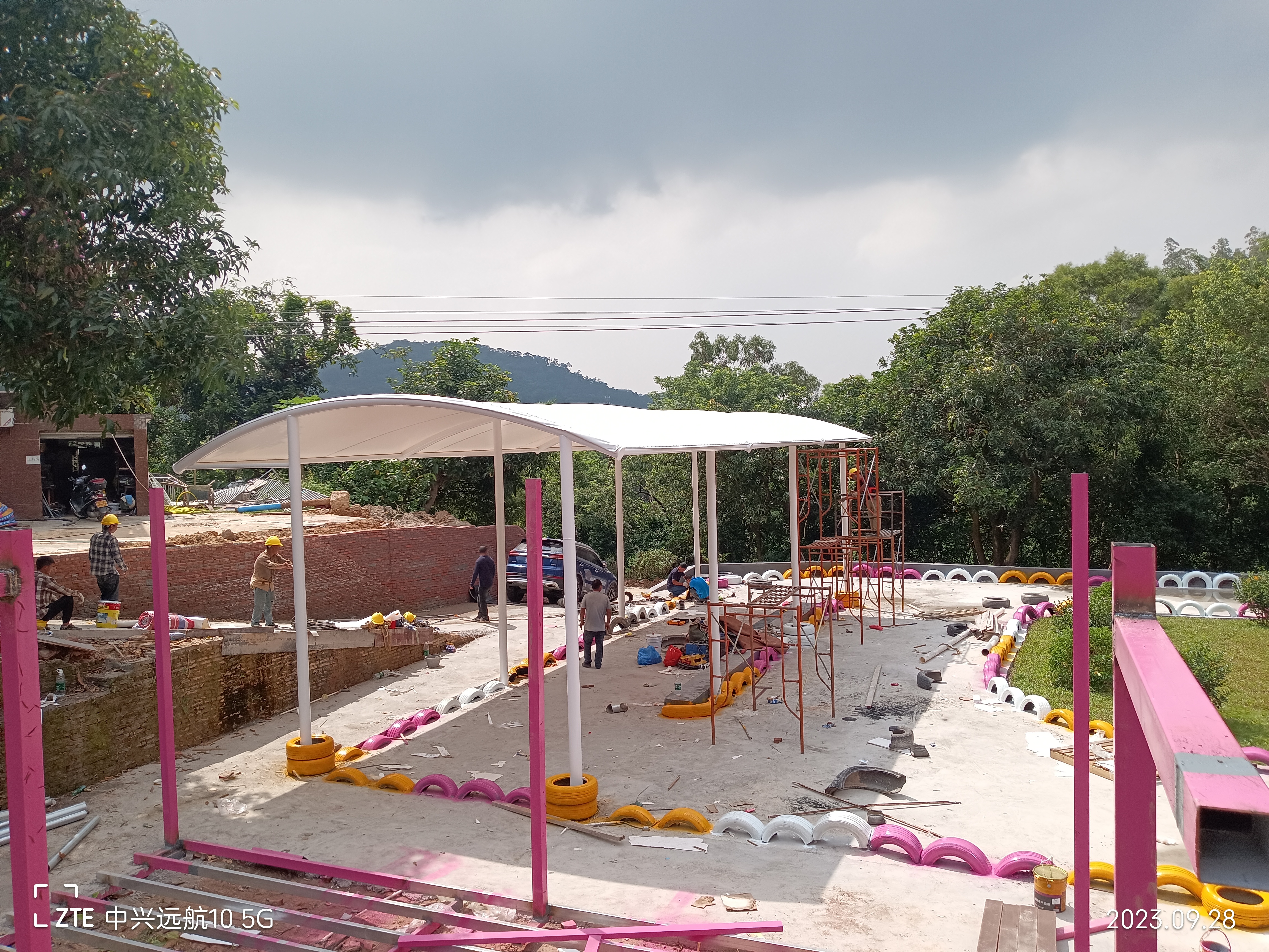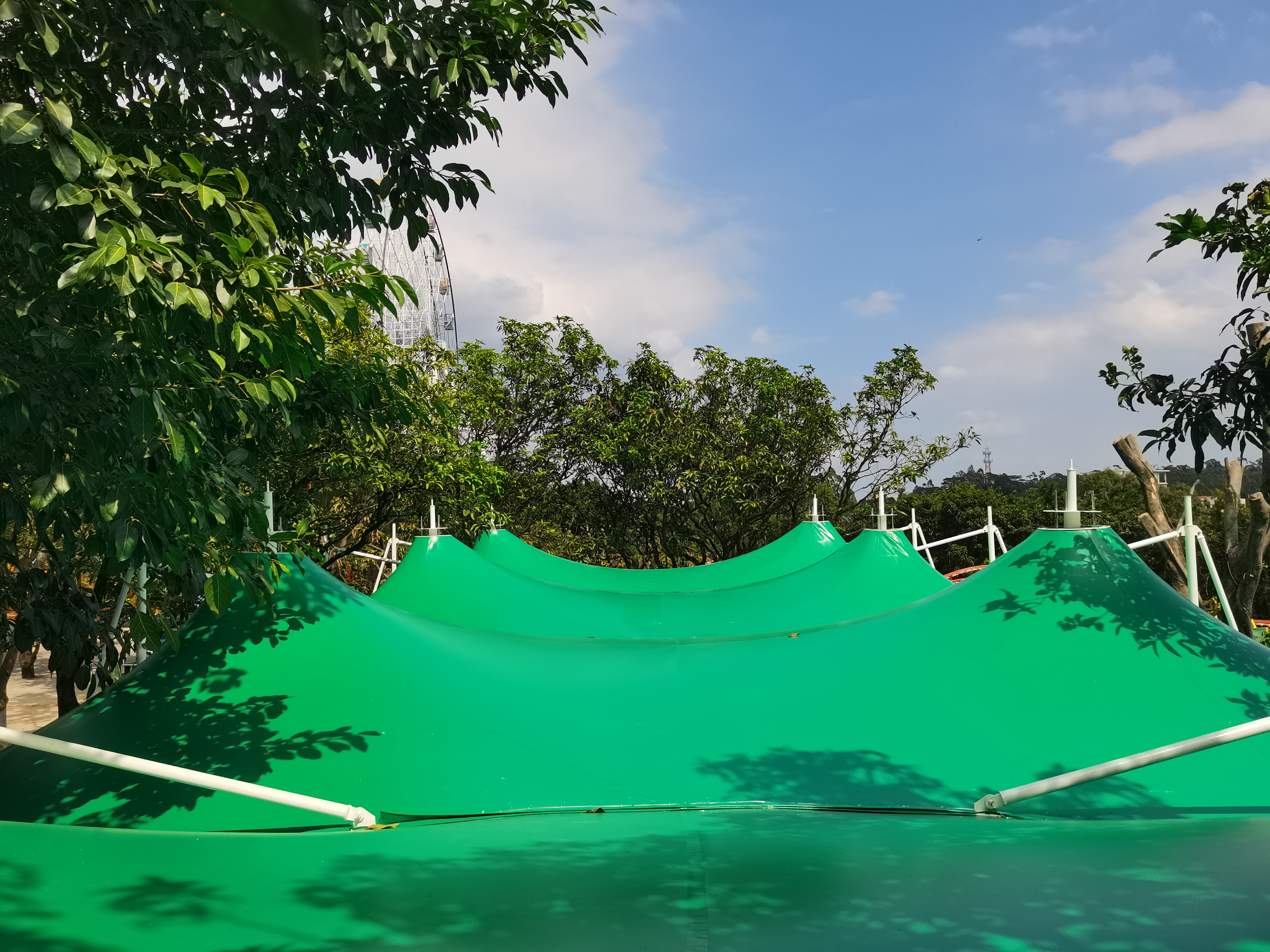 江會(huì)游樂(lè)園位于江門市新會(huì)區(qū)源地路,游樂(lè)園內(nèi)部?jī)和谋拇灿昱锊捎娩撃そY(jié)構(gòu),膜材采用綠色膜材,游客通道采用白色膜材。案例如下: