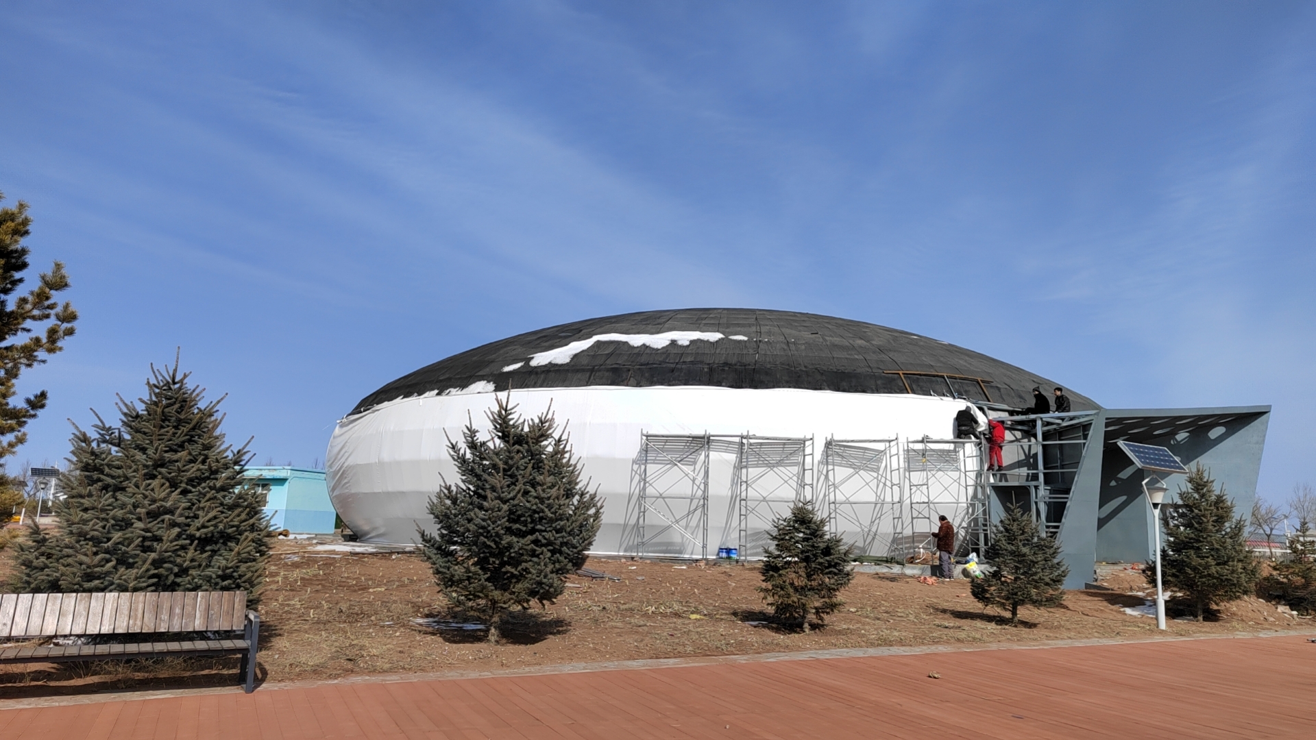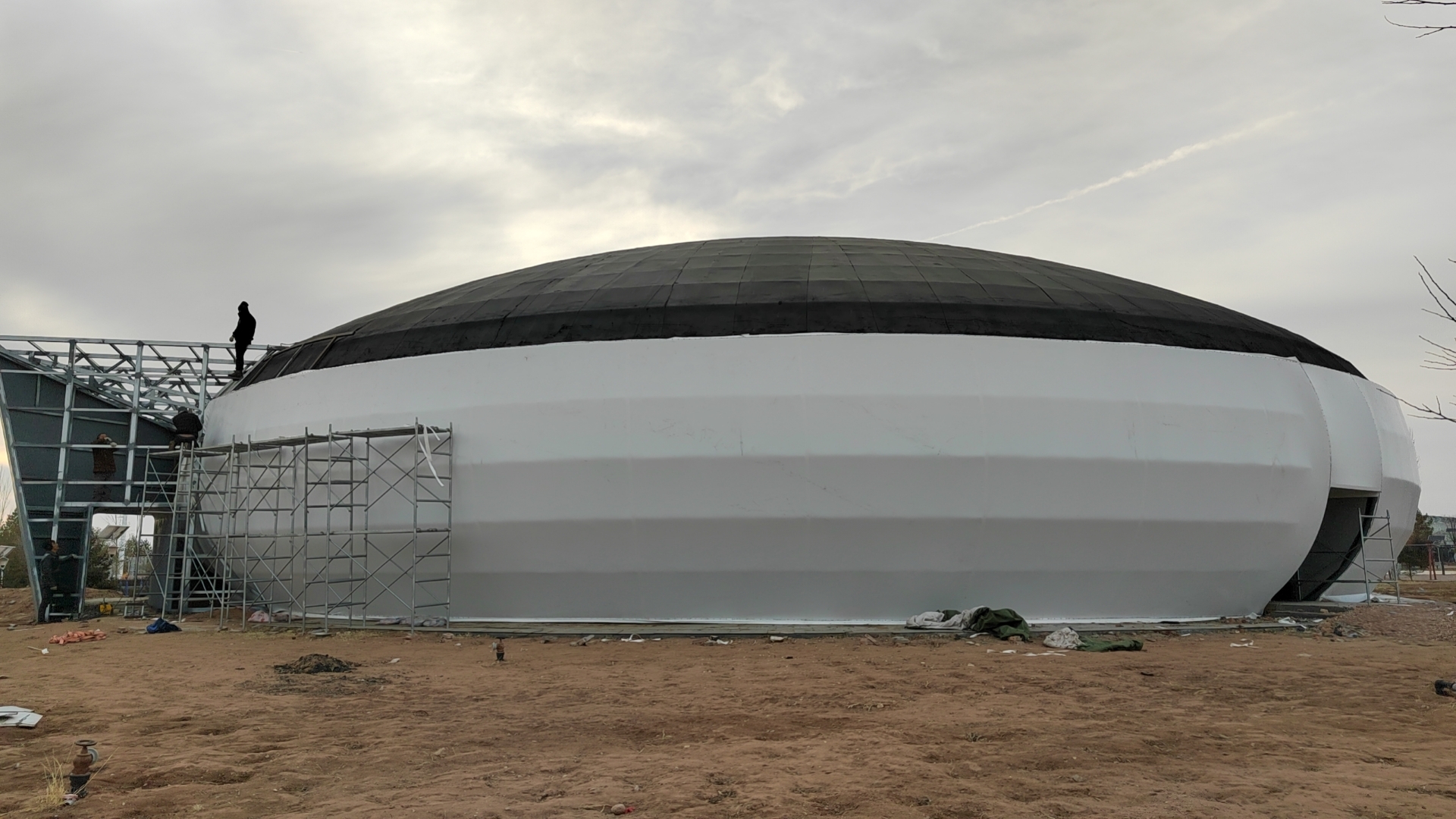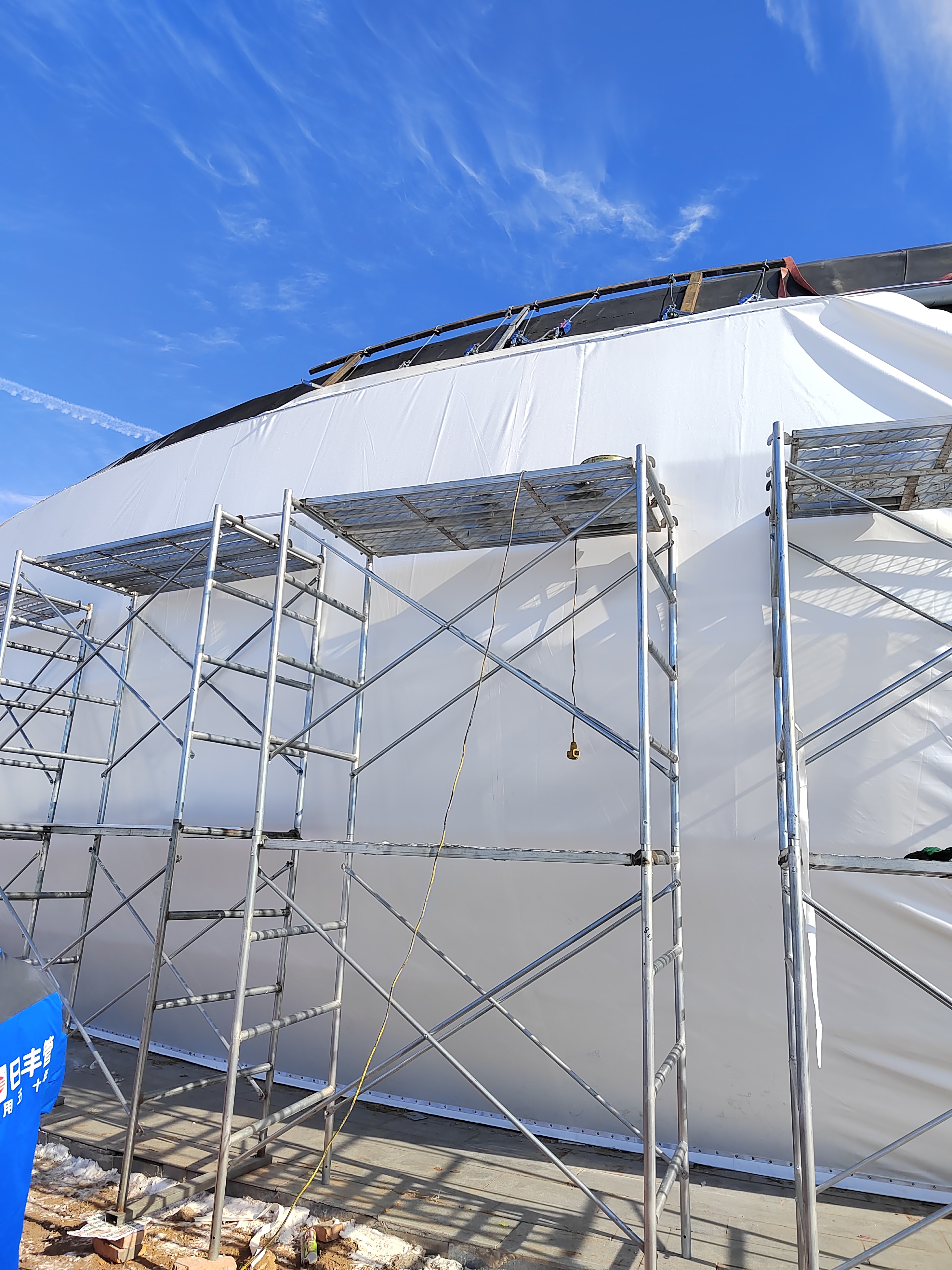 神木現代農業園展示廳膜結構工程位于陜西省榆林市神木市賈家梁村神木現代農業園區內。本工程為直徑35米球殼結構,主結構采用網架結構,外面采用鋁單板+保溫棉+膜結構三層保溫結構,膜結構面積為1800㎡。案例施工照片: