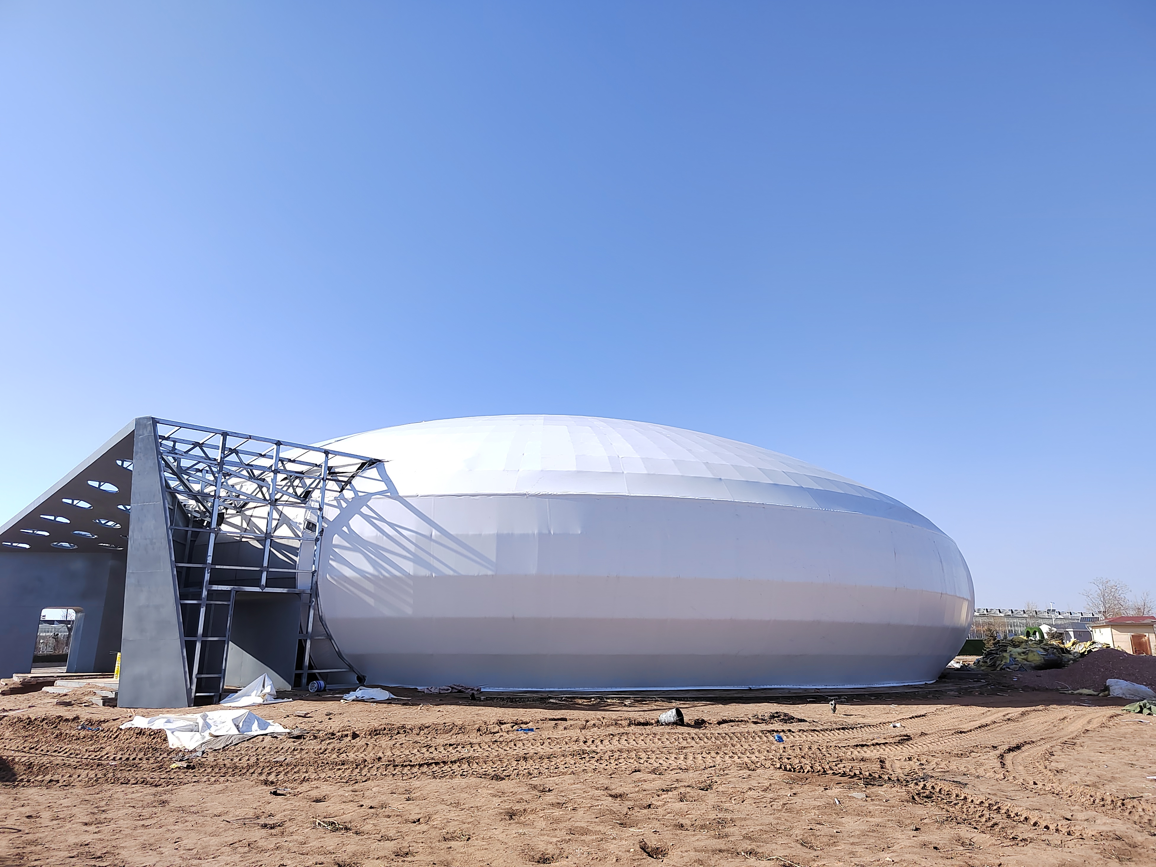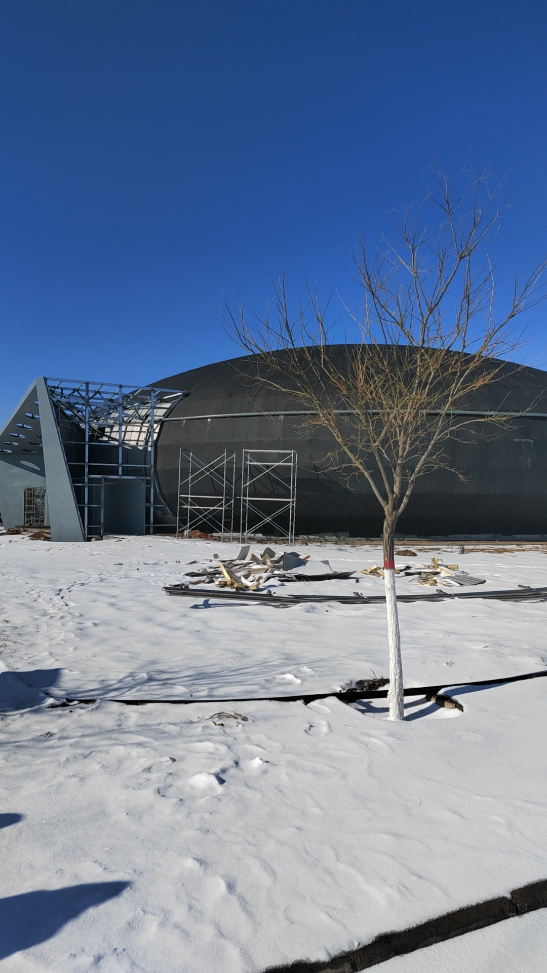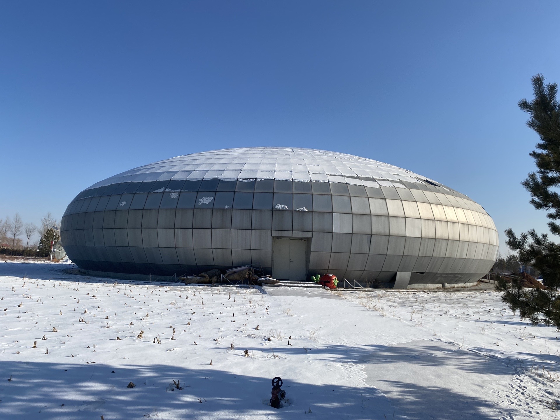 神木現代農業園展示廳膜結構工程位于陜西省榆林市神木市賈家梁村神木現代農業園區內。本工程為直徑35米球殼結構,主結構采用網架結構,外面采用鋁單板+保溫棉+膜結構三層保溫結構,膜結構面積為1800㎡。案例施工照片: