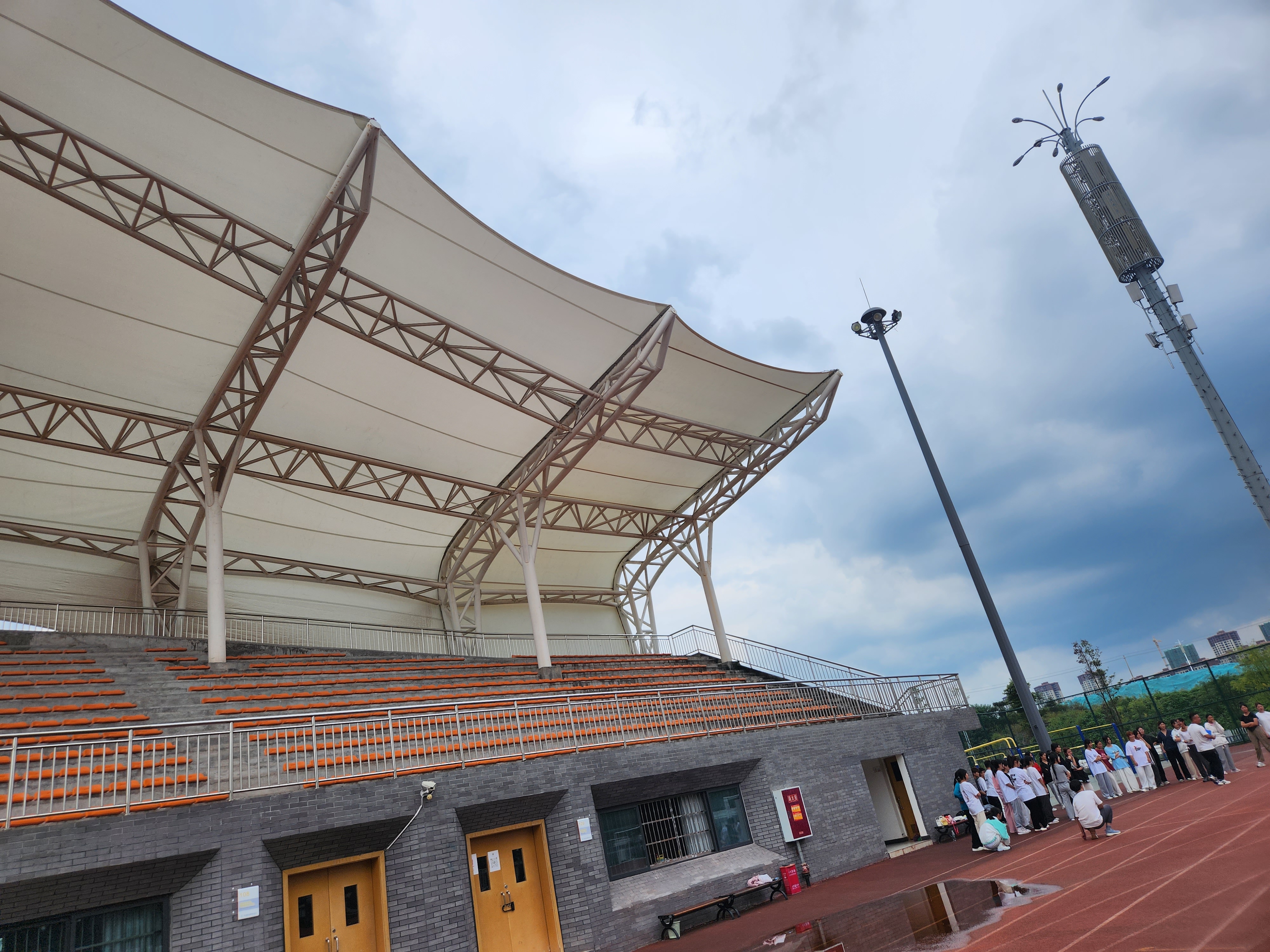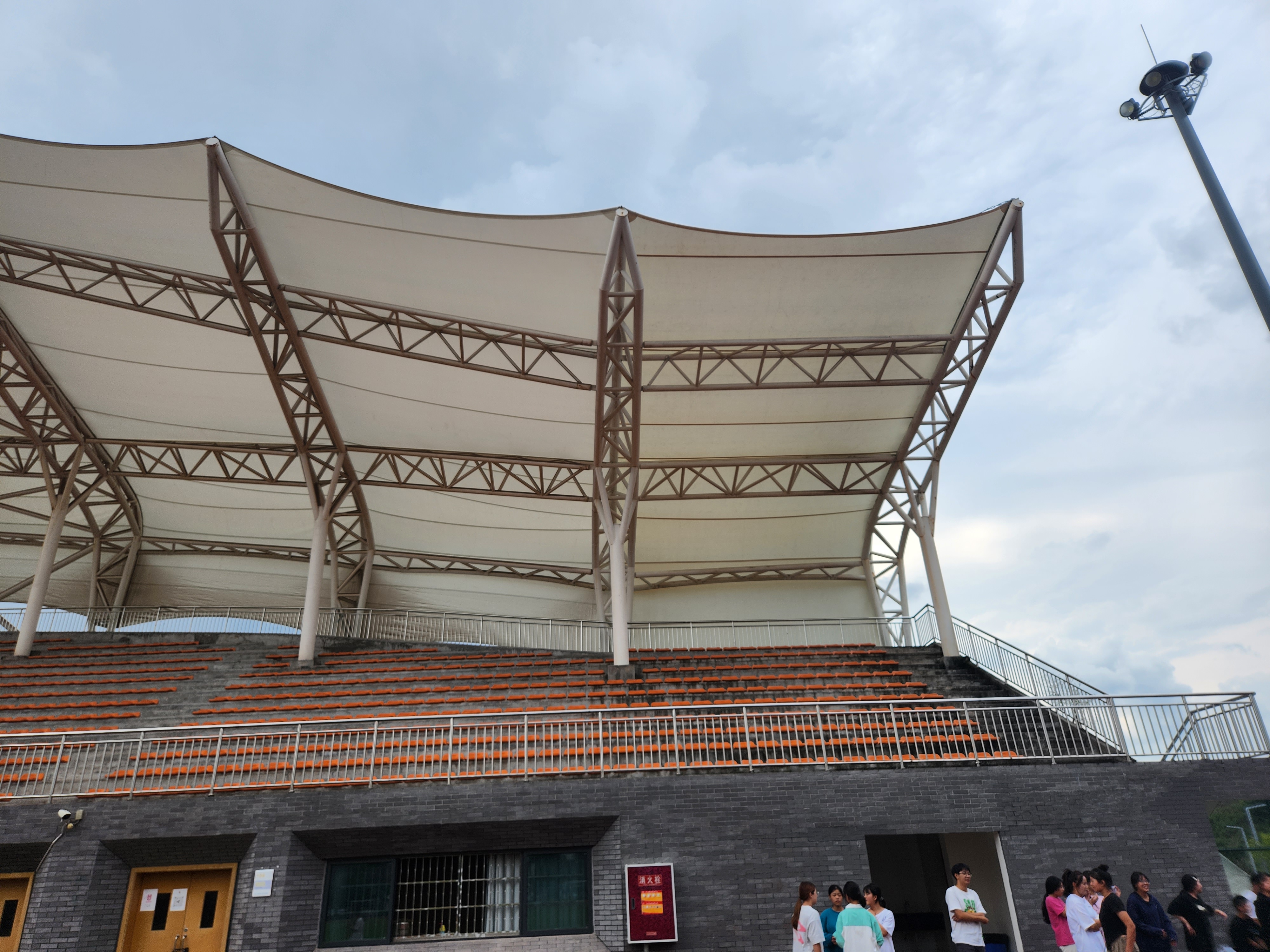 四川衛生康復職業學院位于四川省自貢市沿灘區仙市鎮德銘路3號,學院看臺采用鋼膜結構,膜結構采用PTFE玻璃纖維膜材,經過日照1-2月后變白,質保20年。施工案例如下: